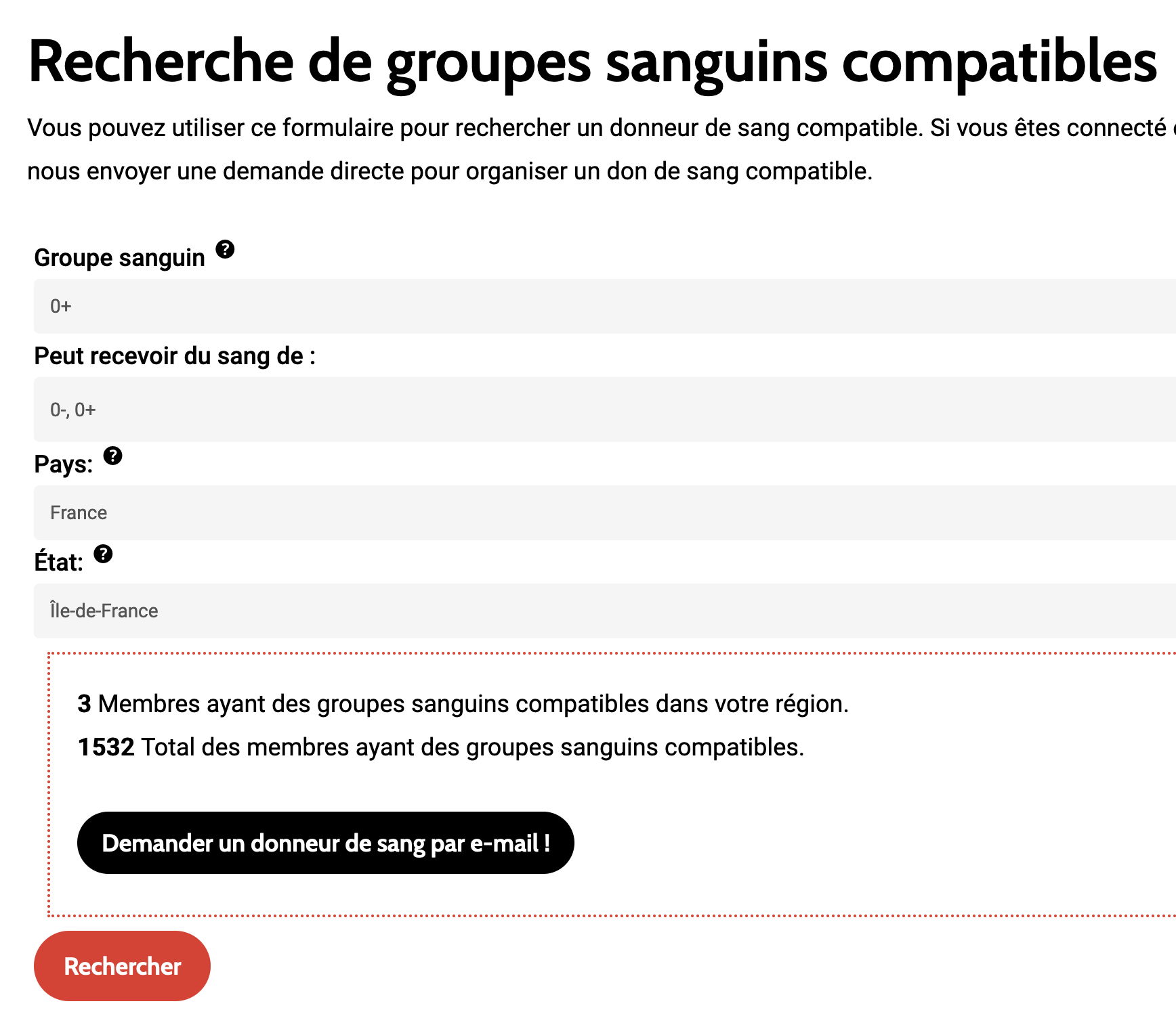 Vous cherchez un donneur de sang, disons, pour une intervention chirurgicale prévue dans 4 semaines. Vous êtes membre de notre organisation et vous vous rendez sur la page Recherche de donneurs de sang. Vous y indiquez votre groupe sanguin, ainsi que le pays et la région où vous avez besoin d’un donneur. Par exemple, vous obtiendrez le résultat suivant :